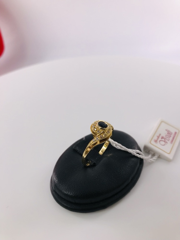 - L’immagine mostra un anello d’oro con diamanti e zaffiro. L’anello ha un design elegante e sinuoso. La pietra centrale è uno zaffiro blu scuro, circondato da piccoli diamanti incastonati che creano un’aura di brillantezza intorno alla pietra principale. La forma dell’anello ricorda un’onda o un motivo a spirale, conferendo un aspetto sofisticato e lussuoso. L’anello è posizionato su una superficie nera, che mette in risalto i dettagli e la lucentezza delle pietre preziose.